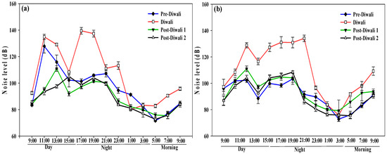 Figure 4 presents the results of noise monitoring in Malda throughout the festivities. The permissible noise limits were found to be surpassed throughout the overall study period. On the celebration day, the highest levels were recorded during the day between 11:00 and 13:00 h and between 17:00 and 23:00 h in the evening. The noise level was higher during the day, particularly 11:00–13:00 h, and 15:00–23:00 h in the late afternoon to night, during Diwali. The recorded noise levels were 134.1 ± 1.96 dB (A) and 139.5 ± 2.48 dB (A) and 134.1 ± 2.40 dB during the daytime and at night in 2023 and 2024, respectively, exceeding the standards set by the CPCB for residential areas by 55 dB [91]. The daytime noise levels were attributed to the large number of people visiting temples to pray, as well as the use of microphones in pavilions/pandals. In contrast, the use of music systems, CD players, cultural programs, and mainly the bursting of firecrackers, contributed to higher noise levels in the evenings. However, the noise levels decreased significantly after 23:00 h, as most people went to sleep. The sound level on Diwali was 13% more than pre-Diwali and 17% lower in post-Diwali 1 than Diwali. According to another study [92], the sound level during the ‘Kali Puja’/Diwali celebrations increased by 19.2% compared to non-festive days in Asansol city. Similarly, Mahecha et al. [93] reported a 30% higher noise level on festive days than on non-festive days in Jaisalmer.