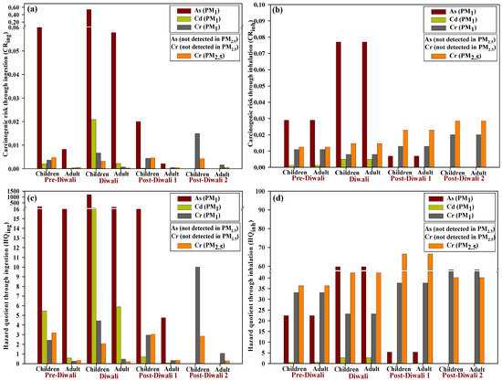 The presence of harmful substances in PM can pose significant risks to human health, including both cancerous and non-cancerous effects. These hazards were calculated by carcinogenic risk (CR) and hazard quotient (HQ), respectively. The CR was determined using both ingestion (CRing) and inhalation (CRinh) routes of exposure to estimate carcinogenic risk, while the HQ was also determined using ingestion (HQing) and inhalation (HQinh) exposure to evaluate the non-carcinogenic risk. According to USEPA, the acceptable level of carcinogenic risk should fall between 1 × 10−6 and 1 × 10−4 [57]. On the contrary, an HQ value below 1 suggests a low likelihood of non-carcinogenicity, while a value higher than one indicates a higher risk of adverse health effects [57]. Furthermore, the hazard index (HI) is employed to calculate the cumulative impact of different substances or exposure pathways. The equations were as follows: