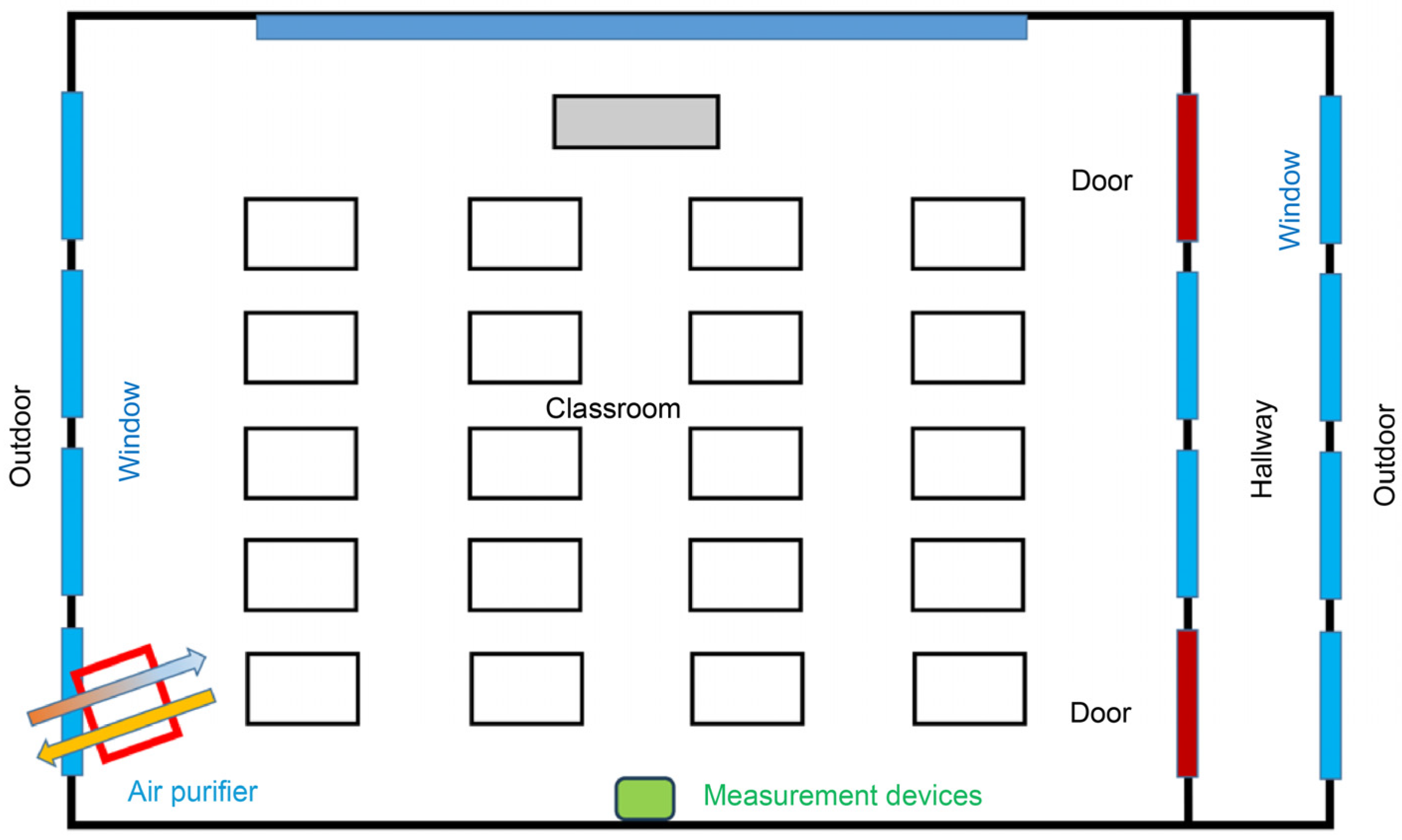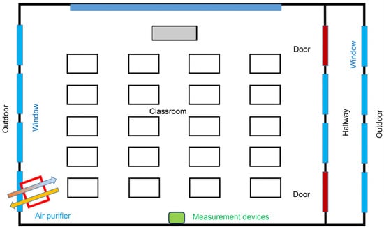 The classrooms were selected based on their comparable ventilation characteristics, building location, and exposure to outdoor air. Their adjacency minimized differences in airflow patterns and external air exposure. The layout of Classroom 1, including the placement of the air purifier, is shown in Figure 2, where the purifier is represented by a red box near the rear window on the left side of the classroom.