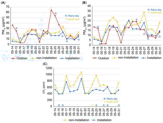 Daily variations in PM10, PM2.5, and CO2 with and without ventilation air purifiers in classrooms. (A) Daily average PM10: installed vs. non-installed vs. outdoor; (B) daily average PM2.5: installed vs. non-installed vs. outdoor; (C) daily average CO2: installed vs. non-installed vs. outdoor. Daily average PM10, PM2.5, and CO2 concentrations in outdoor and indoor environments during study period (14–31 May 2021), comparing classrooms with and without ventilation-type air purifiers. Red line indicates outdoor concentrations, yellow line represents concentrations in classroom without air purifier, and blue line represents concentrations in classroom with air purifier. Green bars (R) denote days with rainfall, and yellow bars (Y) mark days with high concentrations of yellow dust. x-axis represents measurement dates, and y-axis shows pollutant concentrations (µg/m3 or ppm for CO2).