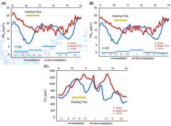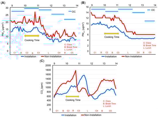 Impact of air purifiers on PM10, PM2.5, and CO2 levels during school activities and cooking times. (A) Time-based PM10 comparison: installed vs. non-installed; (B) time-based PM2.5 comparison: installed vs. non-installed; (C) time-based CO2 comparison: installed vs. non-installed. Hourly variations in PM10, PM2.5, and CO2 concentrations in classrooms with and without ventilation-type air purifiers on 21 May 2021. Measurements were taken from 09:00 to 14:00. Blue and red lines represent concentrations in Classrooms 1 and 2, respectively. ‘C’ marks class time, ‘B’ denotes break time, and ‘L’ represents lunchtime. Yellow arrow and sky-blue solid line labeled ‘OC’ reflect cooking period in school cafeteria and outdoor PM10 and PM2.5 concentrations, respectively. OC: outdoor concentration. x-axis represents measurement time (09:00–14:00), and y-axis indicates pollutant concentrations (µg/m3 or ppm for CO2).