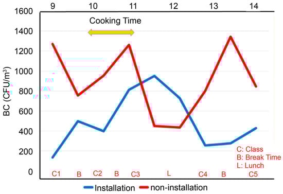 Hourly variations in indoor airborne bacteria concentrations in Classrooms 1 and 2 on 17 May 2021. Measurements were taken from 09:00 to 14:00. Blue lines represent concentrations in Classrooms 1 and 2, respectively. ‘C’ denotes class time, ‘B’ represents break time, and ‘L’ indicates lunchtime. Yellow arrow reflects cooking period in cafeteria. x-axis represents measurement time (09:00–14:00), and y-axis represents airborne bacteria concentrations (CFU/m3). BC: bacteria concentration.