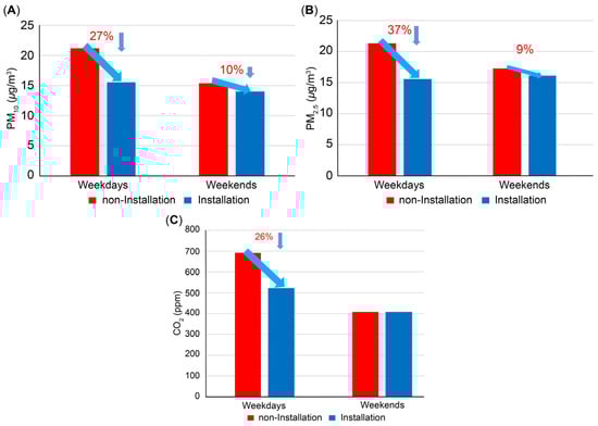 The concentration of indoor air pollutants is significantly influenced by occupant activities, with the presence and movement of children contributing to increased PM (PM10 and PM2.5) concentrations [35]. The present study assessed the effectiveness of ventilation-type air purifiers by comparing PM10, PM2.5, and CO2 levels between weekdays and weekends over a study period of 11 weekdays and 6 weekends. Figure 7 presents a comparison of the average PM10, PM2.5, and CO2 concentrations between weekdays and weekends, highlighting the significant reduction achieved with the ventilation-type air purifiers.
