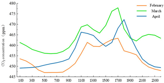 The diurnal CO2 concentration in Nanning exhibits a bimodal structure, with higher concentrations in the afternoon and lower concentrations in the early morning. Peak values are observed around 11:00–13:00, followed by a decline until a trough is reached at approximately 15:00. The concentrations then rise again, peaking around 18:00, before gradually decreasing. Notably, February, coinciding with the Chinese New Year holiday, shows a different diurnal variation pattern compared to March and April. During February, CO2 concentrations rise to 460 ppm by 11:00 and then stabilize, without the distinct bimodal structure seen in March and April. This phenomenon is primarily attributed to reduced urban traffic during holiday periods, which significantly decreases vehicle exhaust emissions from gasoline combustion. This indicates that demographic factors (e.g., population mobility patterns) play a critical role in influencing urban CO2 emissions [20].