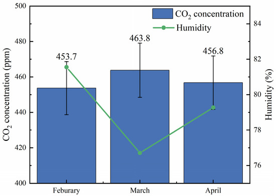 The monthly average CO2 concentration in Nanning during the spring of 2024 reveals significant variations. February recorded the lowest monthly average concentration at 453.7 ppm, while March had the highest at 463.8 ppm, followed by April at 456.8 ppm, as shown in Figure 3. Nanning, located in south-central Guangxi, is characterized by a typical subtropical monsoon climate and a forest coverage rate of 43.81%, earning it the nickname “Green City” [23]. Vegetation growth in this region is minimally affected by temperature changes.