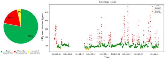 Based on the background data screening results, time periods with source-affected CO2 concentrations were identified. These periods were predominantly concentrated between 14:00 and 18:00 in the afternoon, which coincides with peak hours for human activities such as transportation and industrial production, both of which generate significant CO2 emissions [29].