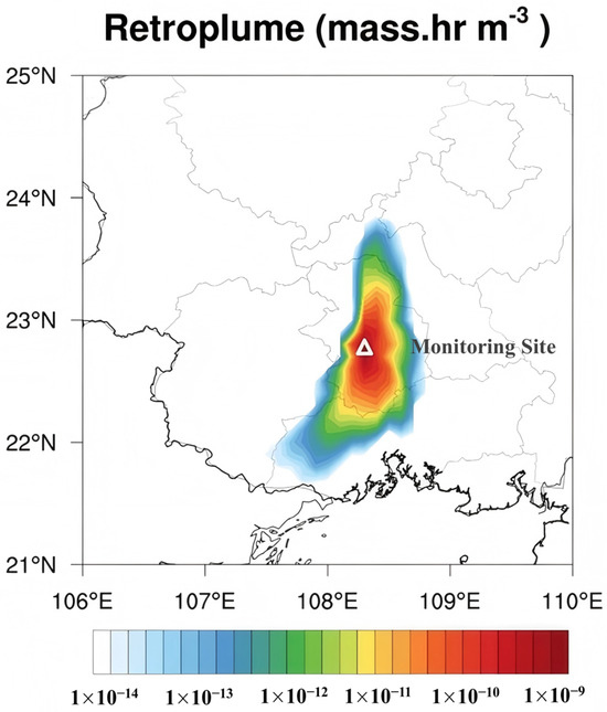 Using the Lagrangian Particle Dispersion Model (LPDM), a 3 h back-trajectory analysis was conducted for the time periods corresponding to source-affected concentrations. The air mass trajectories represent the probability distribution of air parcels transported through the atmosphere to the receptor site. The simulation results, as depicted in Figure 5 and Figure 6, indicate that the primary air mass sources affecting Nanning were from the north and south directions.