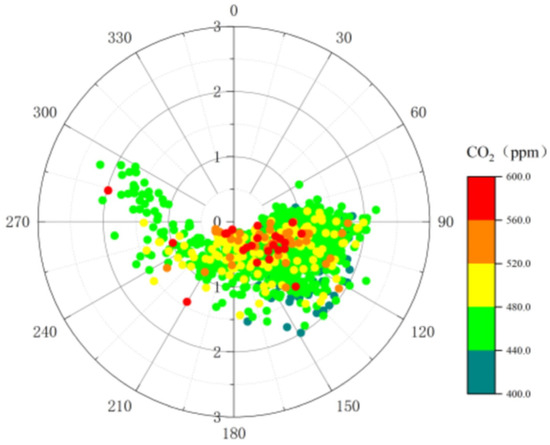 The analysis further shows that CO2 concentrations were higher when wind speeds were between 0 and 2 m/s. Under low wind speed conditions, air movement is slower, resulting in the accumulation of pollutants near the surface, which hampers their dispersion, thus increasing CO2 concentrations [32,33]. This suggests that local high emission sources, primarily from traffic, significantly influence CO2 concentration changes in Nanning, particularly under low wind speed and specific wind directions.