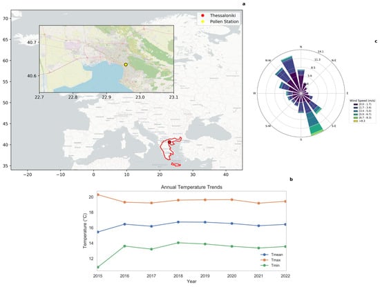 The climate in Thessaloniki is typically Mediterranean, characterized by hot, dry summers and mild, rainy winters, while the urban heat island effect further influences the city’s local conditions [88,89]. The prevailing winds generally blow from the northwest and southeast (Figure 1c). The average annual temperature is 16.35 °C, with 2015 being notable in studied years for having both the highest (20.29 °C) and the lowest (10.88 °C) mean temperature (Figure 1b). These climatic conditions support the growth of plant taxa that contribute to the region’s airborne pollen [90,91,92].