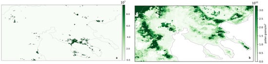 Annual available pollen grains m−2 (AAP) maps of (a) Olea (CORINE (https://land.copernicus.eu/en/map-viewer?dataset=0407d497d3c44bcd93ce8fd5bf78596a, accessed on 8 January 2025)) land cover 2018—100 m, [95] and (b) Quercus (tree species maps for European forests 1 km—EFI, [45,96] species in the study area.