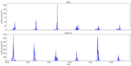Time series of Olea and Quercus daily pollen concentrations from 2016 to 2022 in Thessaloniki, Greece.