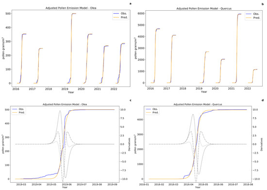 The graphical representations of the adjusted pollen emission models using the one-derivative approach [70] are shown in Figure 4a,b. These figures illustrate the accumulated pollen curves across all studied years, demonstrating that the model effectively captures inter-annual variability in pollen emissions for both taxa, including the highest and lowest recorded emission rates. In Figure 4c,d, the corresponding adjusted curves obtained from the four-derivative method [55] are presented. These figures provide a representative example of the years with the highest pollen concentrations, specifically 2019 for Olea and 2016 for Quercus.
