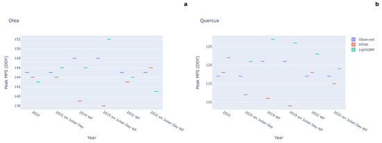 Comparison of peak DOYs for Olea (a) and Quercus (b) taxa using DFNN and LightGBM models.