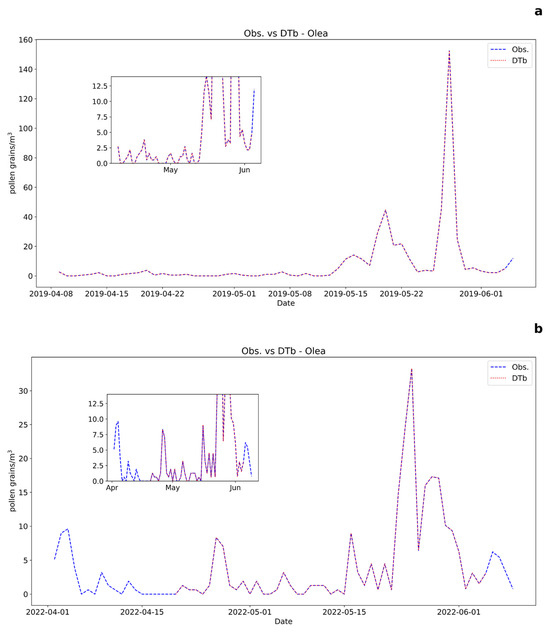 Among the applied methods, the DTb approach demonstrated a strong performance for both Olea and Quercus, particularly in predicting the end of the MPS, with deviations ranging from 0 to 7 days, making it one of the most reliable models in this study, compared to past research in the Mediterranean, which reported an average prediction error of 10 days [52]. For Olea, this improved accuracy in predicting the end of the season may be attributed to the fact that the peak pollen concentrations typically occur after the midpoint of the season (Figure 3), while the start of the season is characterized by lower, more sporadic daily pollen counts. The DTb approach outperformed the simpler DTa model due to the incorporation of transition ranges, which enhanced the model’s ability to account for gradual changes in pollen emission dynamics. This modification allows DTb to better capture the variability of the pollen season, especially in complex urban environments like Thessaloniki. Figure 6a presents a detailed comparison between the observed and predicted pollen concentrations for Olea in 2019, utilizing the DTb approach. This particular year was selected for analysis as it exhibited the highest pollen concentrations among all studied years. The time series analysis reveals minor discrepancies in the timing of the onset and conclusion of the pollen season, with the most pronounced deviations occurring at the beginning. Notably, in 2022, the predicted start of the season differed, highlighting the challenges associated with modeling early-season dynamics (Figure 6b). These results emphasize the capability of DTb in handling the complexities of late-season predictions, while also pointing to the need for further refinements to improve its accuracy in capturing the onset of the pollen season.