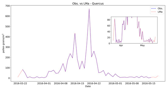 Time series comparison of observed and predicted daily pollen concentrations for Quercus using the LMa model for studied year 2016.