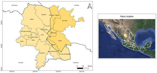 The study area corresponds to CL, located in Northern Mexico, between coordinates 24°22′ and 26°23′ latitude N and 102°22′ and 104°47′ longitude W; it has a surface area of 31,000 km2 [34]. The region is divided into 16 municipalities, 5 of them located in Coahuila de Zaragoza state: Viesca, Torreón, Francisco I. Madero, San Pedro, Matamoros; and 11 located in Durango state: San Juan de Guadalupe, Cuéncame, General Simón Boliva, Mapimí, Gómez Palacio, Nazas, Lerdo, Tlahualilo, San Pedro del Gallo, Rodeo, San Luis Cordero (Figure 1).