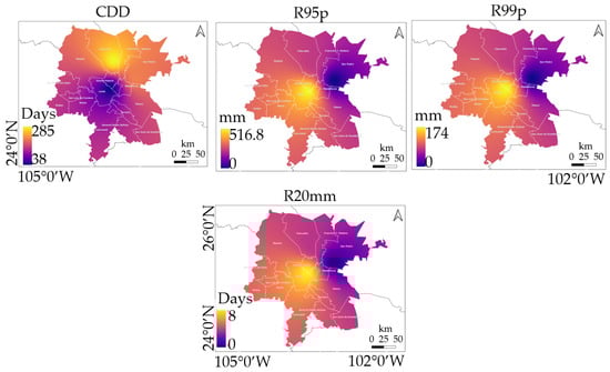 In this case, in the daily climate database used to calculate CC indices, there is a maximum of missing data of 332, 352 and 409, for PP, Tmin and Tmax, respectively, out of 14,976 data. The loss of data occurred mainly in the years 1983, 1990, 1991, 1992, 2008, 2012 and 2013. It is worth highlighting that more than 99% of the data from all stations were available for the study period; hence, these weather stations were considered as greatly important in terms of data availability, especially in view of the scarcity of climate information in Northern Mexico.