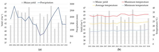 Trends of precipitation (a), maximum temperature, minimum temperature, average temperature (b) and the yield of rainfed maize in the CL.