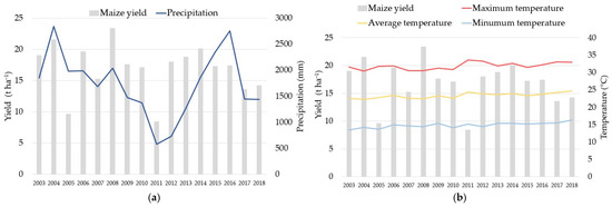 Earlier studies have found a strong interrelationship between annual rainfall and temperature variability and maize production [87]. Low negative and low to moderate positive correlations have been found between mean temperature and precipitation with the silage maize yield, respectively [88]. For instance, it has been reported that climatic parameters account for 40.8% of maize yield under drier-than-normal rainfall conditions; and, soil moisture and minimum and maximum temperatures together accounted for approximately 75% of variations of maize yield under wetter-than-normal conditions [89]. Research has shown that for every 1 °C rise in temperature, the maize yield could be reduced by around 2–3% [17,67]; for example, in the southeastern United States, the indices were used in simulation models, revealing that for each 1 °C increase in summer temperature, maize yields could decrease by 4.6% [80]. However, for every 1 mm increase in precipitation, the maize yield increases by an insignificant amount of 0.014% [67]. Besides, CC affects crop evapotranspiration (ET) and therefore the irrigation water requirement [90].