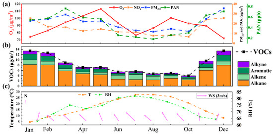 The seasonal variations of O3, NOx, PM2.5, PAN, and VOCs are influenced by a combination of atmospheric photochemical reactions and meteorological conditions. The summer peaks in O3 and PAN are primarily driven by active photochemical reactions, with VOCs and NOx serving as precursors interacting under conditions of sunlight and high temperatures. The concentrations of NOx and PM2.5 are higher in winter, largely due to anthropogenic emissions and meteorological factors such as combustion emissions and poor atmospheric dispersion. VOC compositions are dominated by alkanes in winter, whereas in summer, they participate in atmospheric chemical reactions and are rapidly consumed, exacerbating O3 formation. The seasonal fluctuations in meteorological conditions (temperature, relative humidity, and wind speed) play a critical role in pollutant formation, dispersion, and deposition. In particular, the higher temperatures and wind speeds in summer facilitate the generation or dispersion of pollutants.