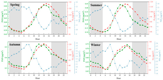 Diurnal patterns of PAN, O3, and NO2 concentrations in different seasons, The red line represents O3, the blue line represents NO2, and the green line represents PAN. The shaded areas indicate nighttime periods.