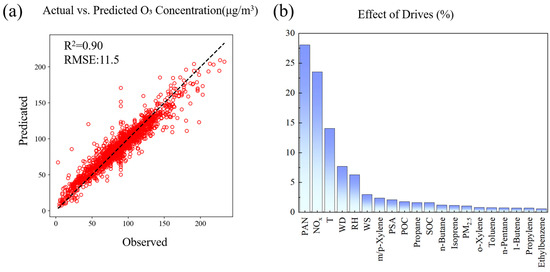 Validation and analysis of O3 prediction model estimated as RF: (a) scatter plot of observed vs. predicted O3 concentrations with model performance metrics; (b) feature importance of drivers in O3 concentration prediction.
