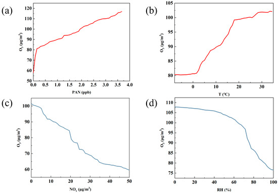 Based on the machine learning analysis using partial dependence plots (PDPs), the figure reflects the role of four key factors—PAN, temperature, NOx, and relative humidity [33]—in O3 generation. These figures, respectively, show the impact of each factor on O3 concentration changes within a specific range, from which we can identify how these factors affect O3 concentration and thus deduce their positive and negative effects in predicting O3 concentration.