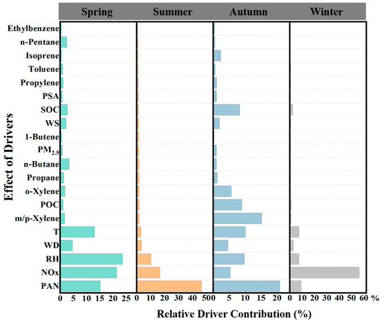 In Figure 6, we observe the contributions of various chemical components and meteorological factors to the prediction of O3 concentrations in spring. Notably, temperature, relative humidity, NOx, and PAN all play significant roles in O3 formation. Among these, NOx is the largest contributing chemical factor in spring. Temperature and relative humidity also have key roles, which is closely related to the accelerated photochemical reaction rates and the influence of humidity on O3 generation. Changes in relative humidity notably impact O3 concentration prediction, while higher temperatures promote O3 formation [54,55]. It is worth noting that VOCs, such as ethylbenzene, n-pentane, and isoprene, contribute less in spring, likely due to the lower reactivity of VOCs under cooler conditions.
