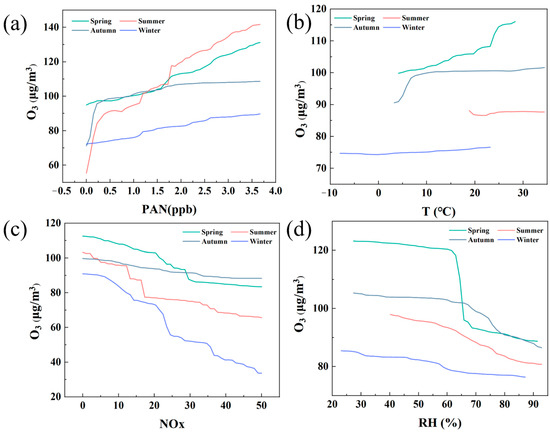 Firstly, Figure 7a shows the influence of PAN concentration on O3 generation. In all seasons, the increase in PAN concentration leads to an increase in O3 concentration, but this upward trend is most significant in summer. This can be attributed to the fact that under the conditions of abundant sunshine and high temperature in summer, PAN, as a product of photochemical reaction, greatly promotes the generation of O3. Especially in summer, the O3 concentration rises rapidly with the increase in PAN, reflecting the strong driving effect of summer photochemical reaction. In contrast, the O3 concentration in winter is lower and less affected by the change in PAN, which reflects the characteristics of insufficient light and inactive photochemical reaction in winter.