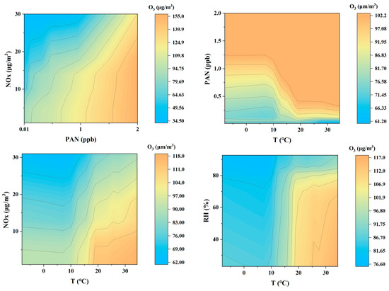 Figure 7 shows the influence of different meteorological factors and pollutants on O3 concentration by 2D-PDP analysis and compares them in spring, summer, autumn, and winter. Overall, the generation of O3 is closely related to season, precursor substances (such as PAN and NOx) and meteorological factors (such as temperature and relative humidity), and their influences show significant differences in different seasons.