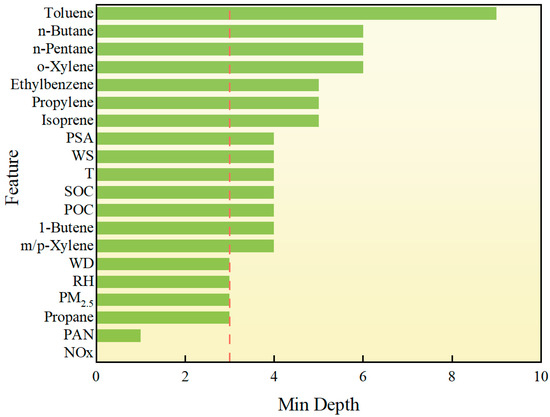 The above RF-based analysis of O3 drivers briefly illustrates their respective impacts. Since O3 is affected by multiple complex drivers, the interaction between multiple drivers also plays a vital role in the formation of O3. Therefore, it is necessary to study the different factors. Although RF cannot be directly used to study the interaction between paired drivers, exploring the structure of RF decision trees can help extract information from different factors. The main method of this structural mining analysis is based on the concept of minimum depth, that is, the minimum distance from the depth of a factor to the root of the tree. The minimum depth is within 3, which represents a strong contribution to the prediction of O3. For a single factor, if its MD is shallow, it is considered to be more important for the prediction of O3. As shown in Figure 9, in the minimum depth analysis of the RF model, NOx, and PAN are the most important features for predicting O3 concentration. The same as the previous feature importance and SHAP analysis. Although PAN itself is a secondary pollutant, it has a far-reaching impact in atmospheric chemistry, especially through its thermal decomposition to release NOx, which continues to affect O3 production. In addition, as one of the VOCs, propane also has a relatively low minimum depth, showing its greater contribution in the model. This is attributed to the reaction of propane with OH· in the atmosphere to form PAN precursors. Although PM2.5 (fine particulate matter) has a complex relationship with O3 generation, it can indirectly affect O3 concentration by adsorption, scattering, or changing the chemical environment in the atmosphere. The effects of meteorological factors such as relative humidity [33] and wind direction on O3 generation are more reflected in the transmission and diffusion of pollutants. For example, changes in wind direction may affect the accumulation and dilution of pollutants between regions, while humidity can inhibit the occurrence of certain photochemical reactions and indirectly reduce O3 generation.