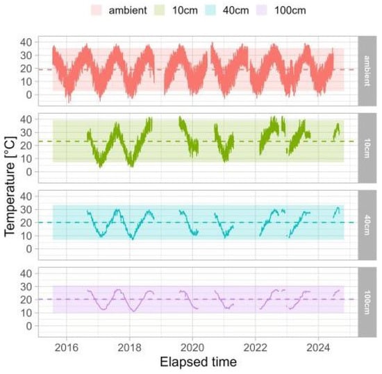 Figure 1 presents the measured ambient temperature collected at a height of 100 cm above the ground and temperature profiles at depths of 10, 40, and 100 cm over a 9-year period from 24 July 2015 to 25 October 2024. However, the dataset is incomplete due to technical difficulties such as power outages or equipment malfunctions.