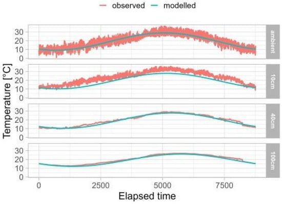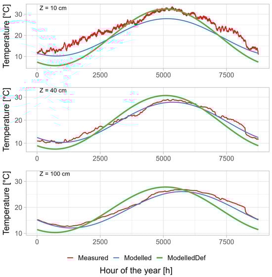 Figure 5 compares “Measured” soil temperature data with two different modelling approaches across three soil depths (10, 40, and 100 cm). Each data point represents the mean value for that specific hour calculated over the 9-year measurement period. The “Modelled” dataset was generated using Equation (2) with site-specific input parameters derived from Table 2. In contrast, the “ModelledDef” dataset was created using constant literature values of thermal diffusivity () for volcanic soil from previous studies [22,23] and parameter from our field measurements.