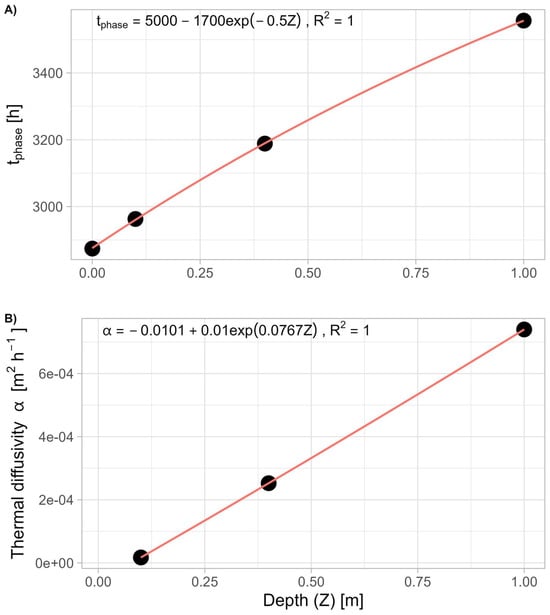 Moreover, as seen in Figure 3B, the relationship between thermal diffusivity () and depth (Z) is exponential, given by . This indicates an increase from almost zero at the surface to approximately 7 × 10−4 m2 h−1 at a depth of 100 cm.