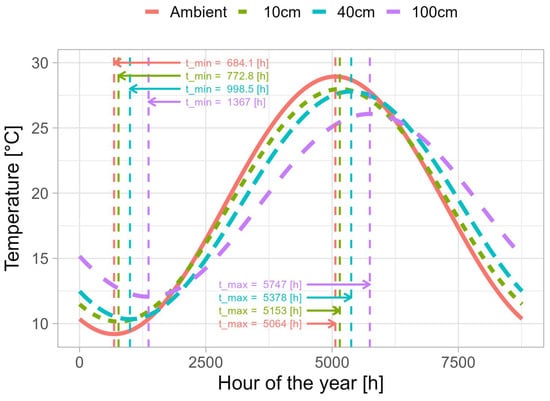 A critical aspect of the graph is the time shift in minimum and maximum temperatures at varying depths. The analysis reveals that minimum temperatures progressively lag with increasing depth relative to the ambient minimal temperature measured at the end of January (≈ 683 h of the year ∼ 28 days). The delay is 88 h (≈3.5 days ∼end of January) at a depth of 10 cm, 311 h at 40 cm (≈13 days ∼middle of February), and 681 h at 100 cm (≈28 days ∼end of February). A similar trend is measured for maximum temperatures, which also exhibit a lag with a depth in relation to the maximum of ambient temperature at 5064 h of the year (≈end of July). The delay is 79 h at 10 cm (≈3.3 days ∼ beginning of August), 310 h at 40 cm (≈13 days ∼middle of August), and 680 h at 100 cm (≈28 days ∼end of August).