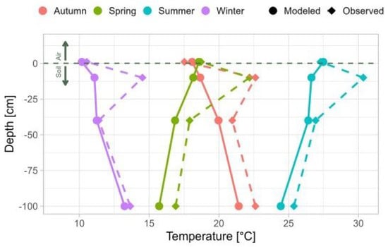These seasonal couplings likely reflect the transition periods in annual soil temperature cycles, where winter–autumn represents the cooling phase and summer–spring the warming phase of the soil profile. The similarity in patterns despite different absolute temperatures indicates the consistent nature of heat transfer processes during these paired seasons, though the model captures these dynamics with varying degrees of accuracy across different depths.