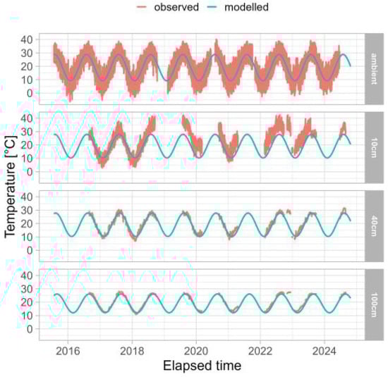 At the ambient level, the measured temperatures show considerable variability, with clear seasonal oscillations ranging from −6 to 40 °C. The model data exhibit comparable seasonal patterns but with reduced short-term variability, resulting in a more idealized sinusoidal curve in the range of 10 to 30 °C. Moving deeper into the soil profile, at depths of 10, 40, and 100 cm, several key patterns emerge. Initially, at a depth of 10 cm, the model initially underestimates the measured temperatures. While the modelled data closely match the observations during the first years of measurement, they show increasing divergence in subsequent years. This progressive deviation could be attributed to either changing environmental factors or gradual sensor deterioration. Secondly, the amplitude of the temperature fluctuations gradually decreases with depth, suggesting a dampening effect of the soil environment. At a depth of 100 cm, the temperature fluctuations are markedly less pronounced compared to the ambient measurements. Thirdly, a substantial enhancement in the congruence between measured and modelled temperatures and depth is evident, allowing for the capture of both diurnal and seasonal temperature fluctuations. Consistent annual temperature cycles, with summer peaks and winter troughs, are measured across all depths, though their amplitude diminishes with depth. This illustrates the soil’s thermal buffering capacity, where deeper layers exhibit increased stability and temperature patterns that more closely align with model expectations.