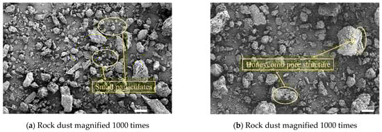 To investigate the microstructural characteristics of dust samples, coal and rock dust specimens were examined using a scanning electron microscope (SEM, CIQTEK Co., Ltd. China University of Mining and Technology; (Hefei, China)) at magnifications of 1000 times and 25,000 times. An electron beam generated by the electron gun was directed onto the sample surfaces to acquire morphological and compositional information.