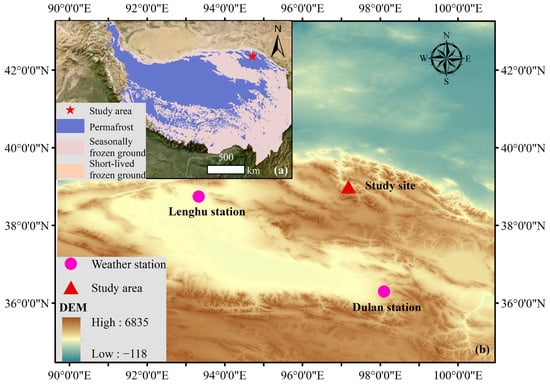 Study region and sites in the Shulenanshan region in the western subrange of the Qilian Mountains, Qinghai Province, China. Notes: (a) The location of the study area in the permafrost zone of the Qinghai–Tibetan Plateau. The map color indicates regions of permafrost (blue), seasonally frozen ground (rose), and short-lived frozen ground (sand). Modified from Ran et al. [26]; (b) DEM image of the middle part of the western Qilian Mountains showing the location of the study site and national weather station. Elevation data were downloaded from Shuttle Radar Topography Mission (SRTM)DEM accessed on 23 September 2014 (https://earthexplorer.usgs.gov/).