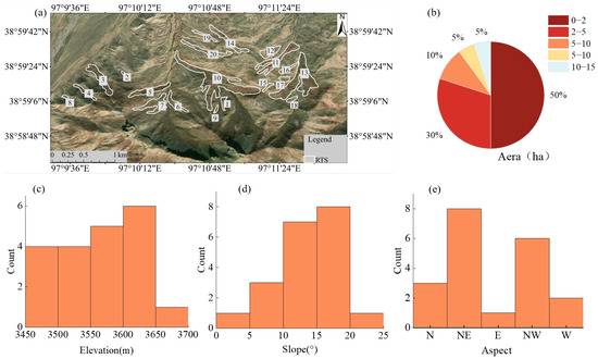Spatial distribution map and statistical summaries of RTS terrain and geometric characteristics: (a) RTS distribution within the study area, the numbers with gray background represent the identification numbers of the RTSs. (b) frequency distribution of RTS area, (c) distribution of RTS slope angles, (d) frequency of RTS occurrence at different elevations, and (e) distribution of RTS slope aspects.