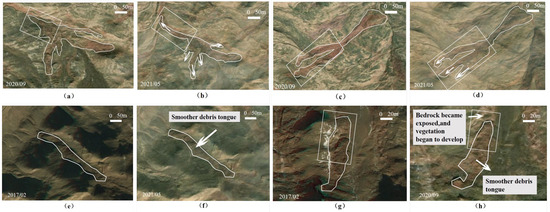 Spatiotemporal changes of RTS areas at different development stages: RTS No. 10 (a,b) and No. 11 (c,d) at the active development stage; No. 4 (e,f) at stable development stage, and No. 9 (g,h) at mature stage. Remote-sending images were acquired from PlanetScope between February 2014 and October 2023 (https://earth.esa.int).