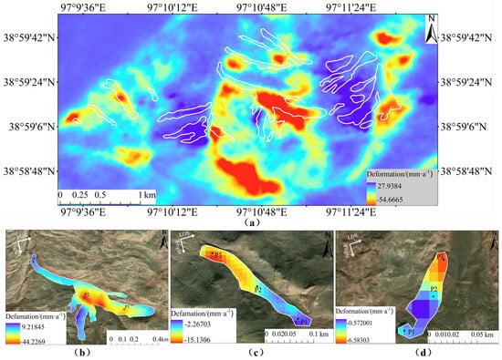 Map of annual ground surface deformation rate (line-of-sight) derived from descending Sentinel-1 images (28 October 2014–30 August 2023) (a) and RTS annual ground surface deformation rate at different developmental stages: RTS No. 10 (active) (b), RTS No. 4 (stable) (c), and RTS No. 9 (mature) (d). The LOS arrows indicate the satellite line-of-sight direction, Flight represents the satellite flight direction, P1, P2, and P3 refer to the locations of characteristic points selected at different elevations of the RTS.