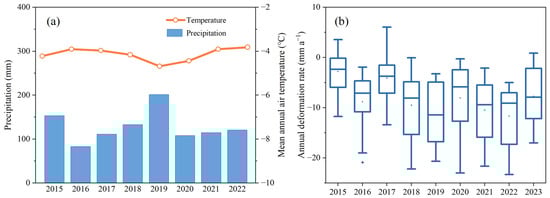 Local precipitation and temperature data of the study area derived from the Climatic Research Unit gridded Time Series (CRU TS) monthly high-resolution gridded multivariate climate dataset (a) and the box plot of the ground surface annual deformation of 20 RTSs within the study area (b).