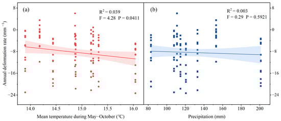 To investigate the influence of temperature and precipitation on landslide movement rates, statistical tests were conducted to assess the correlations between meteorological parameters (mean temperature from May to October and annual precipitation) and movement rates. As depicted in Figure 7, a statistically significant correlation (p < 0.05) was observed between the mean temperature during the warm season and landslide movement rates. Although annual precipitation did not exhibit a statistically significant correlation with movement rates, a positive trend was noted, indicating a general increase in movement rates with higher precipitation levels. The lack of a statistically significant correlation between precipitation and movement rates can potentially be explained by two primary factors: (1) the region’s arid climate, characterized by consistently low annual precipitation, which may limit the influence of rainfall as a primary trigger for slope instability; and (2) the restricted sample size of rainfall-induced landslide events within the dataset, which may diminish the statistical power necessary to detect subtle relationships between precipitation and movement. Notably, the study area exhibited the lowest MAAT in 2019 within the 2015–2022 period, yet InSAR-derived deformation measurements demonstrate anomalously high deformation rates, which consistently coincide with extreme rainfall events. Heavy precipitation events drive permafrost degradation and slope instability through coupled hydrological–thermal mechanisms. Substantial rainfall infiltration raises the water table, destabilizes slopes, and simultaneously transfers latent heat to the permafrost table. This dual process accelerates ground ice ablation and increases pore water pressure within the active layer, promoting both active-layer detachment failures and RTS initiation. Intense precipitation, particularly when coinciding with early snowmelt, further amplifies thermal erosion and accelerates headwall retreat rates [30]. The study area in the western Qilian Mountains exhibits characteristics of a continental arid climate, with mean annual precipitation of ~100–200 mm concentrated in the warm season (June–August). The shallow snowpack and limited snow water equivalent suggest minimal spring meltwater influence on slope deformation. Notably, 2019 experienced significant precipitation anomalies, recorded in both CRU TS4.06 gridded data and observations from the Lenghu meteorological station, although temperatures were not extreme. This hydrometeorological event coincided with peak retrogressive thaw slump (RTS) activity, as evidenced by the maximum mean deformation rate of −9.62 mm/yr observed between 2014 and 2024. This acceleration occurred despite lower mean annual temperatures, highlighting the dominant role of liquid water input over thermal controls in driving short-term RTS dynamics.