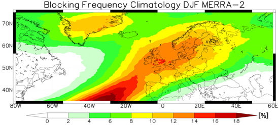 Blocking climatology of a 2D blocking index (see text for definition). Blocking index is calculated using MERRA-2 Z500 winter (DJF) daily data for 1980/81–2021/22 period. Units: percentage of blocked days to total number of winter days.