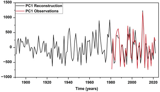 Blocking PC1 for the period 1980/81–2021/22 (red) and predicted PC1 for the period 1891/92–2021/22 (black).