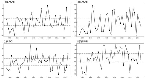 Normalized time series for each monsoon index. EASMI: (a) East Asian Monsoon index; (b) SESMI: South Asian Monsoon index; (c) AZCI: Asia Zonal Circulation index; (d) QTPMI: Tibetan Plateau Monsoon index.