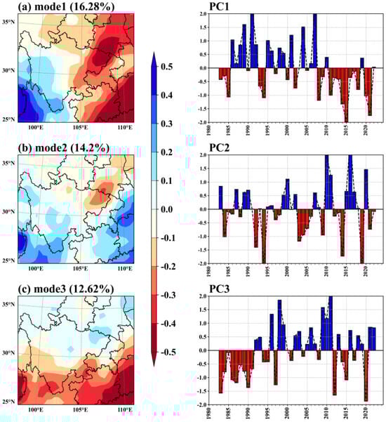 Following further empirical orthogonal function analysis of the WCAP from 1983 to 2022, the spatial distribution characteristics of the first three empirical orthogonal function modes are shown in Figure 3a–c, and their explained variances are 16.28%, 14.2%, and 12.62%, respectively, with a cumulative variance contribution of approximately 43%. The spatial distribution type of the first mode mainly exhibits the characteristics of a precipitation inverse phase change in the northeast–southwest direction. When the time coefficient anomaly of the first mode is positive (negative), the northeast has low (high) precipitation. Moreover, precipitation shows a spatial distribution reversal trend in 2008, which changes from more southwest–northeast to less southwest–northeast precipitation, and precipitation at 106–109° E and 31–34° N exhibits a sharp transition between drought and flood. The second mode has the Yangtze River at 30° N as the boundary; precipitation in the north and south changes inversely, the center of drought and flooding is the same as that in the first mode, and the interannual amplitude is intensified after 2010. The third mode shows the opposite spatial distribution to the second mode. The above findings are consistent with previous research on WCAP [31,32].