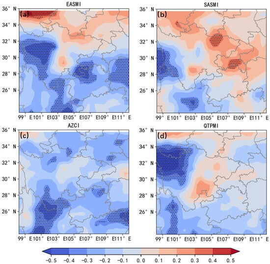 To explore the influence of each monsoon system on WCAP, we calculated the correlation coefficients between each of the four indices and WCAP during the same period. According to Figure 4a, EASMI is predominantly negatively correlated with WCAP but positively correlated in northern China; four regions (90–112° E, 24–36° N) exhibit a significant negative correlation (passing the 95% significance test), but a significant positive correlation is observed at 98–103° E, 34–36° N. The SASMI and WCAP correlation results (Figure 4b) indicate a positive correlation region at 105–110° E, 28–33° N, and a significant negative correlation region in the southwestern part of West China. The AZCI and WCAP correlation results (Figure 4c) show an overall negative correlation, with significant negative correlation centers at 100–105° E, 24–29° N and 108–112° E, 25–26° N (passing the 95% significance test). The QTPMI and WCAP correlation results (Figure 4d) show a significant negative correlation at 98–103° E, 29–35° N (passing the 95% significance test).