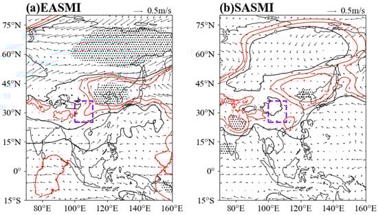 Zhang et al. [22] defined the SASMI using the area-averaged 850 hPa latitudinal winds at 85–100° E and 10–18° N minus the latitudinal winds at 83–95° E and 23–27° N as follows: